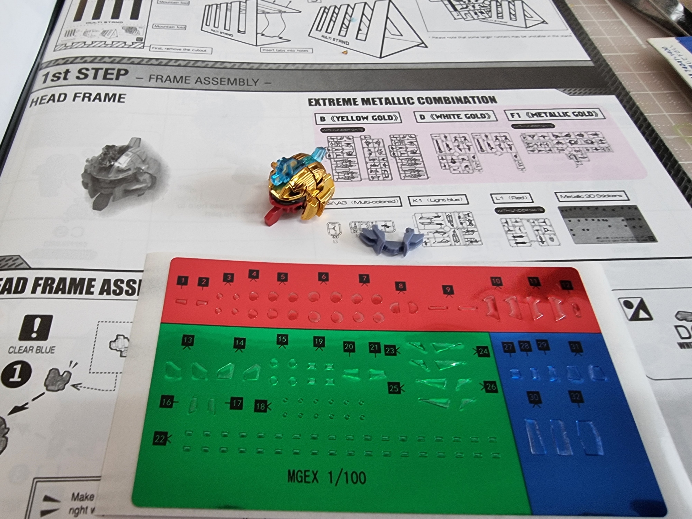 메탈스티커가 약간 맘에들진 않지만 일단 설명서에 있는대로 붙이면서 진행해 보기로 한다. 일단 MGEX 스프덤의 프레임은 도색할 일이 없을것 같아서....
