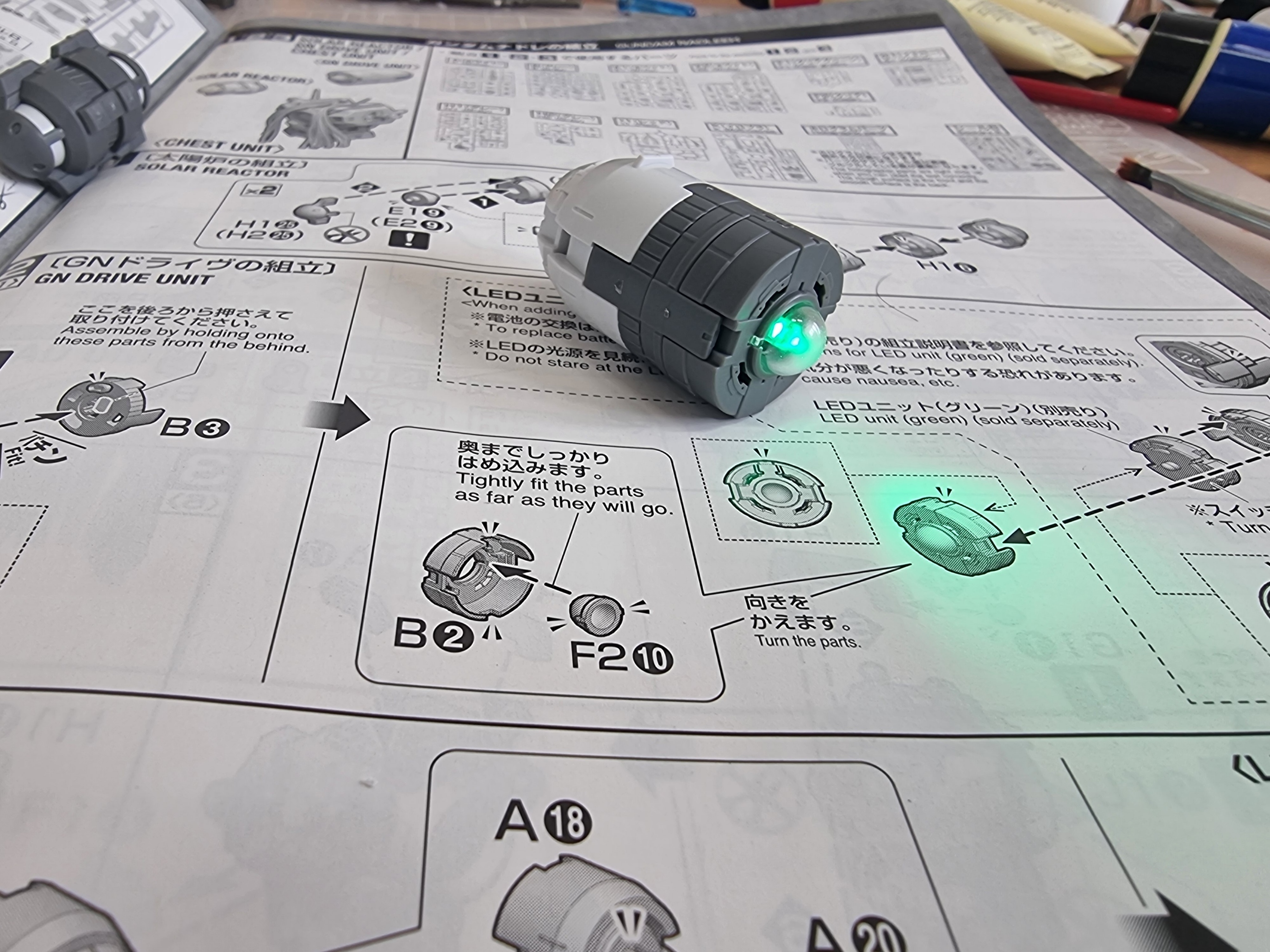 GN드라이브를 연결시키고 불을 켜보니 글이 보인다. 솔레스탈 비잉이라고 써져 있다. 그리고 스티커가 살짝 비틀어져 버렸다. 하나가 더 있으니까 나중에 다시 붙여 줘야 겠다.
